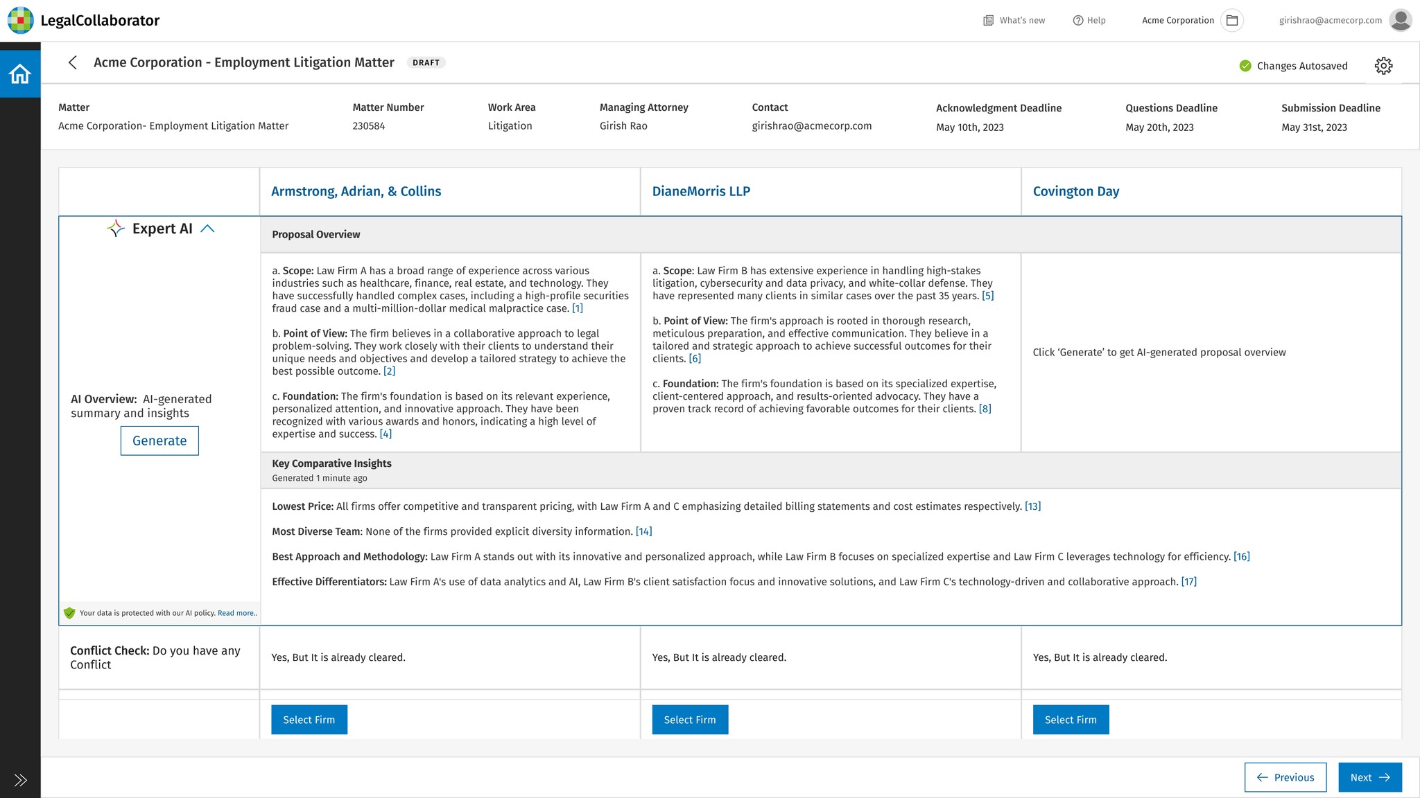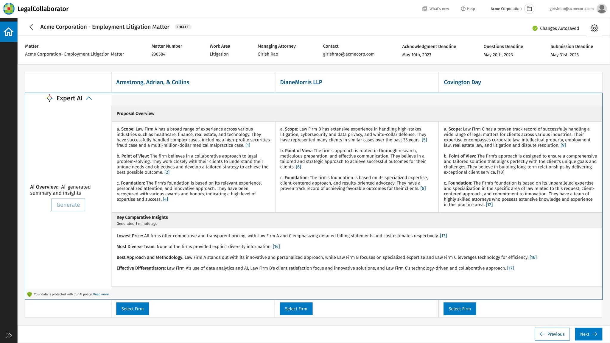 As part of LegalCollaborator’s evolution, we introduced Generative AI-powered summarization and analysis tools that enhance how corporate legal teams evaluate law-firm proposals.
