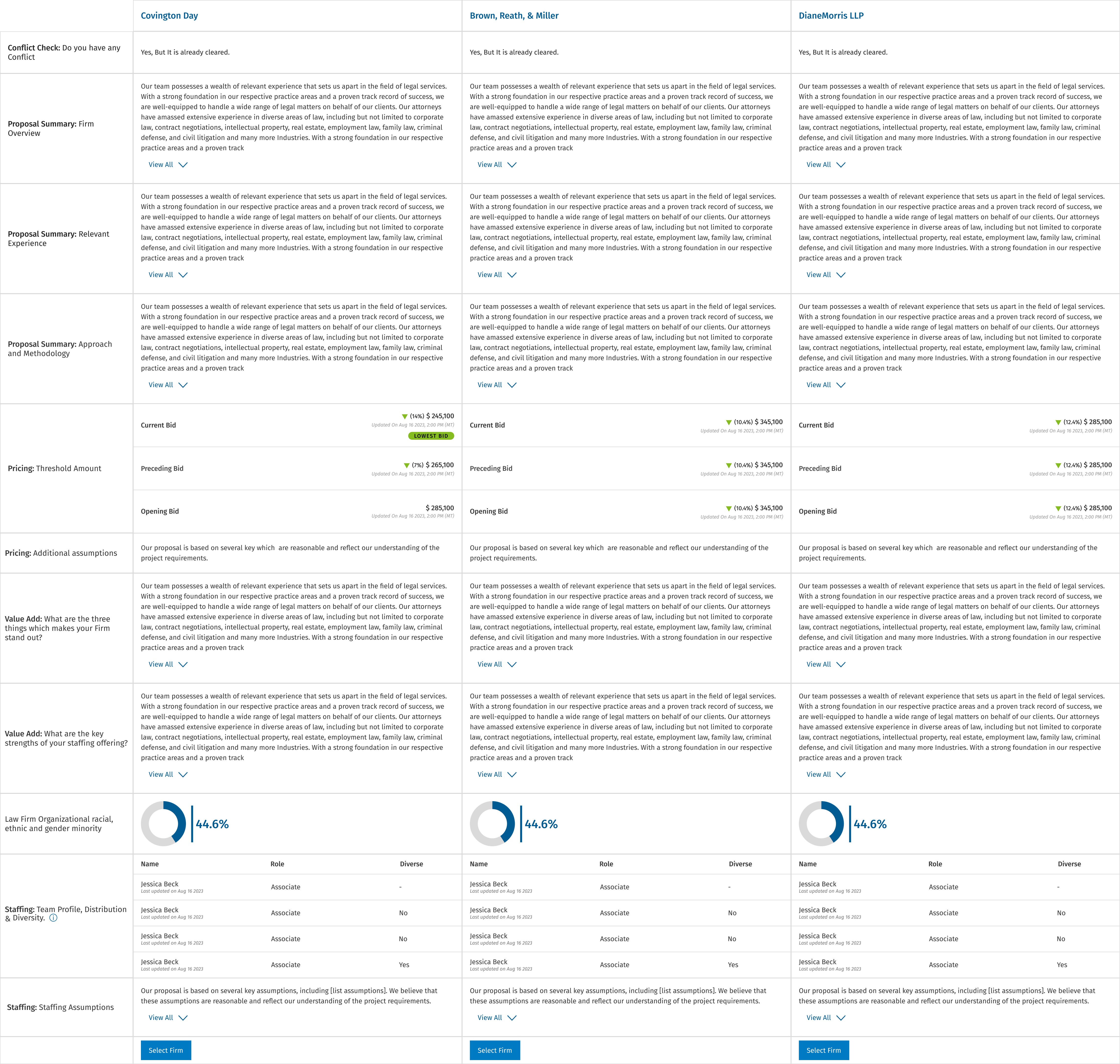 No Transparency: Law firms view only their own bids and proposals.