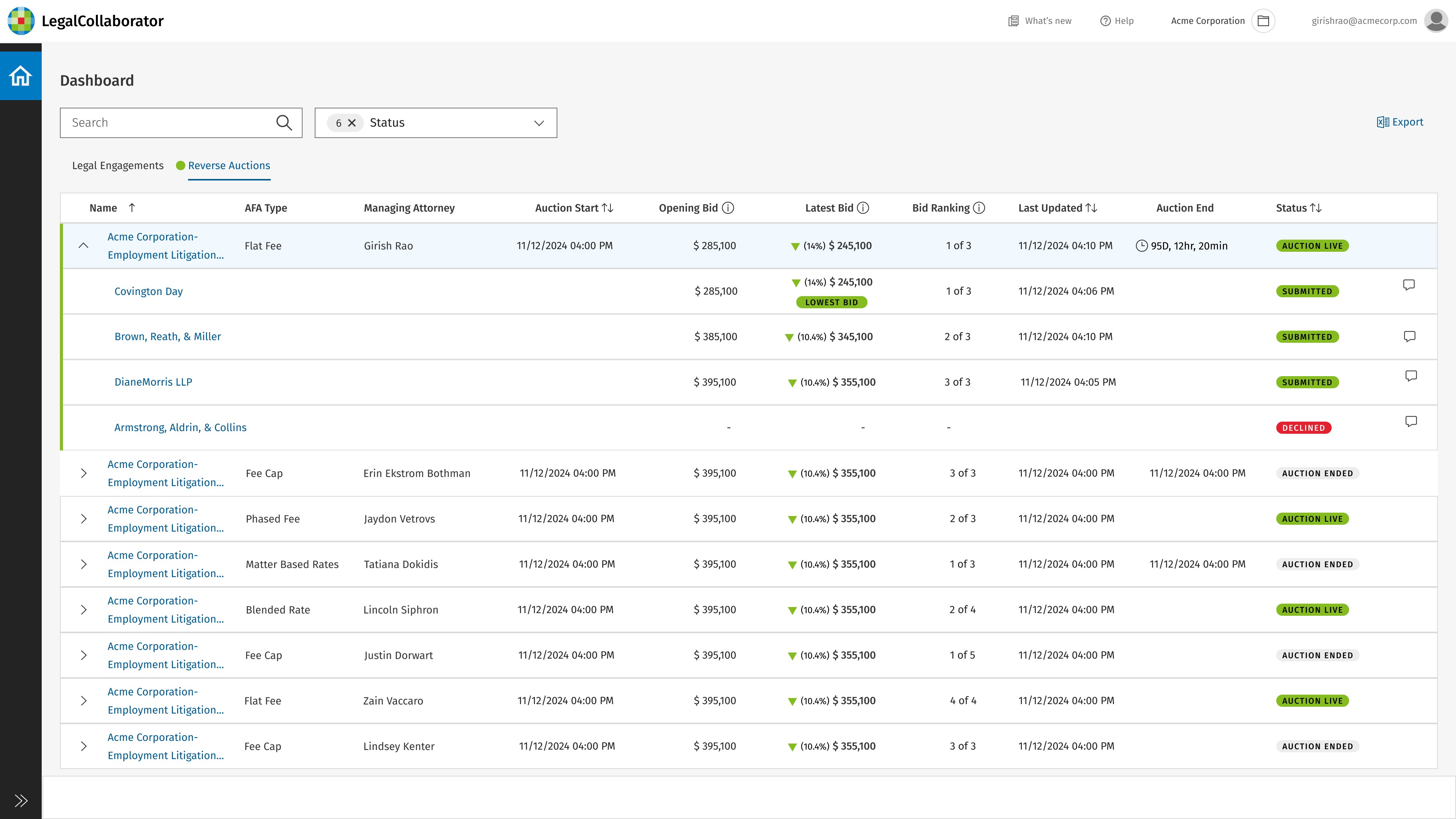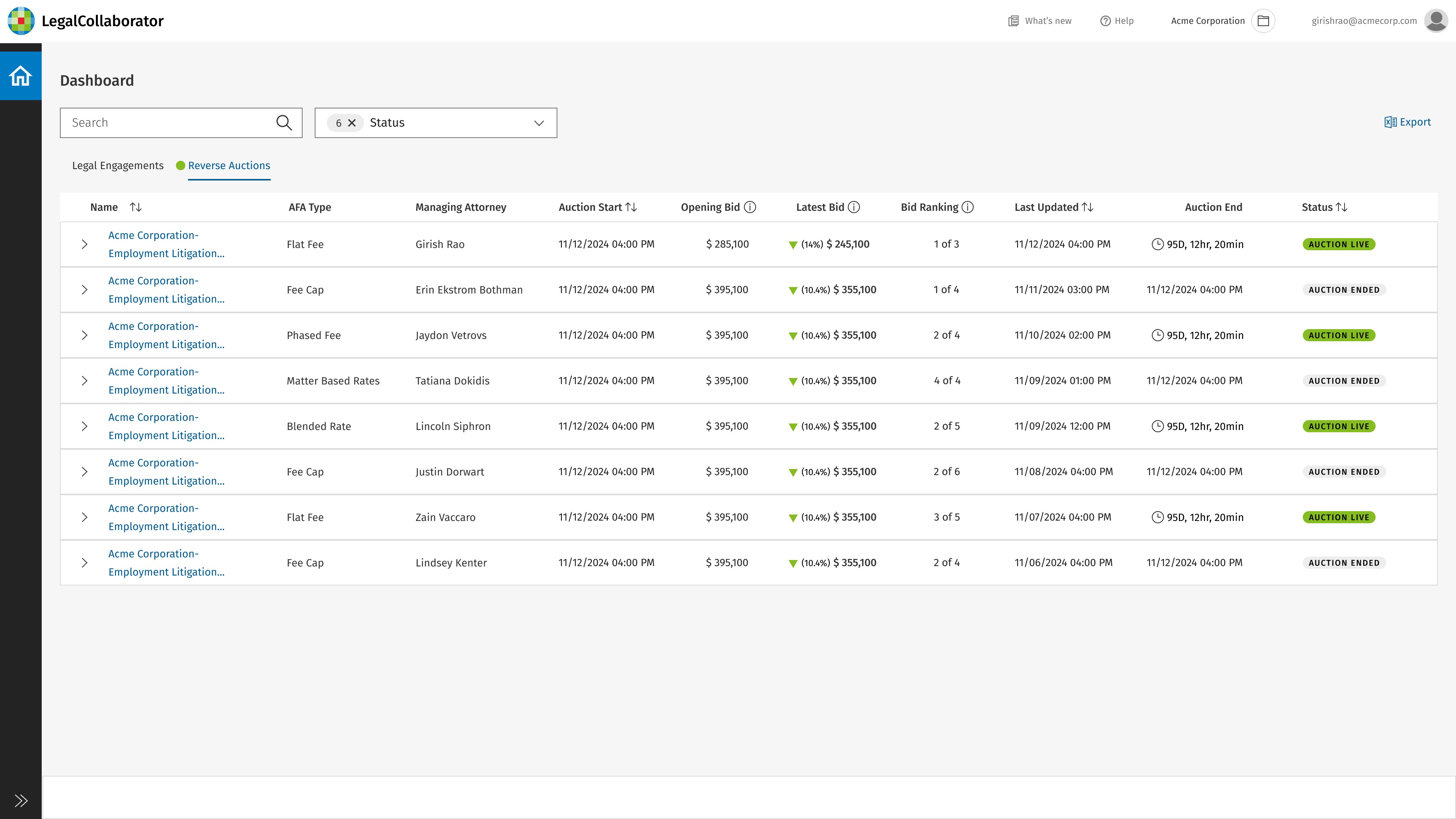 Cost Optimization: Reverse auctions encourage firms to sharpen pricing in real time, helping corporate legal reduce engagement costs while maintaining quality.