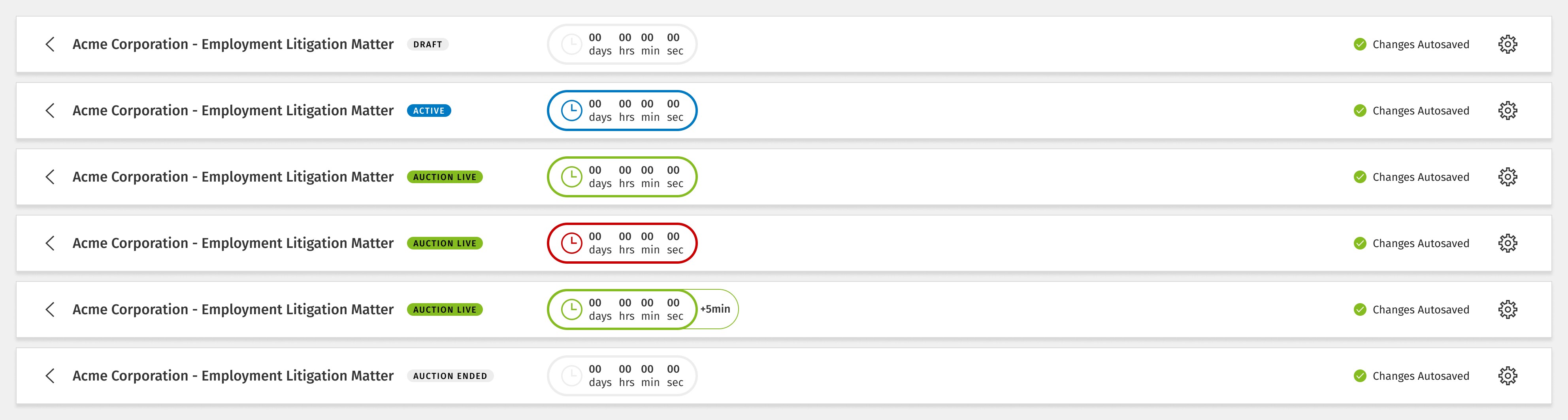 Configurable Transparency: Multiple auction modes (no, partial, and full transparency) allow legal teams to align bidding dynamics with matter sensitivity, market norms, and firm relationship strategies.