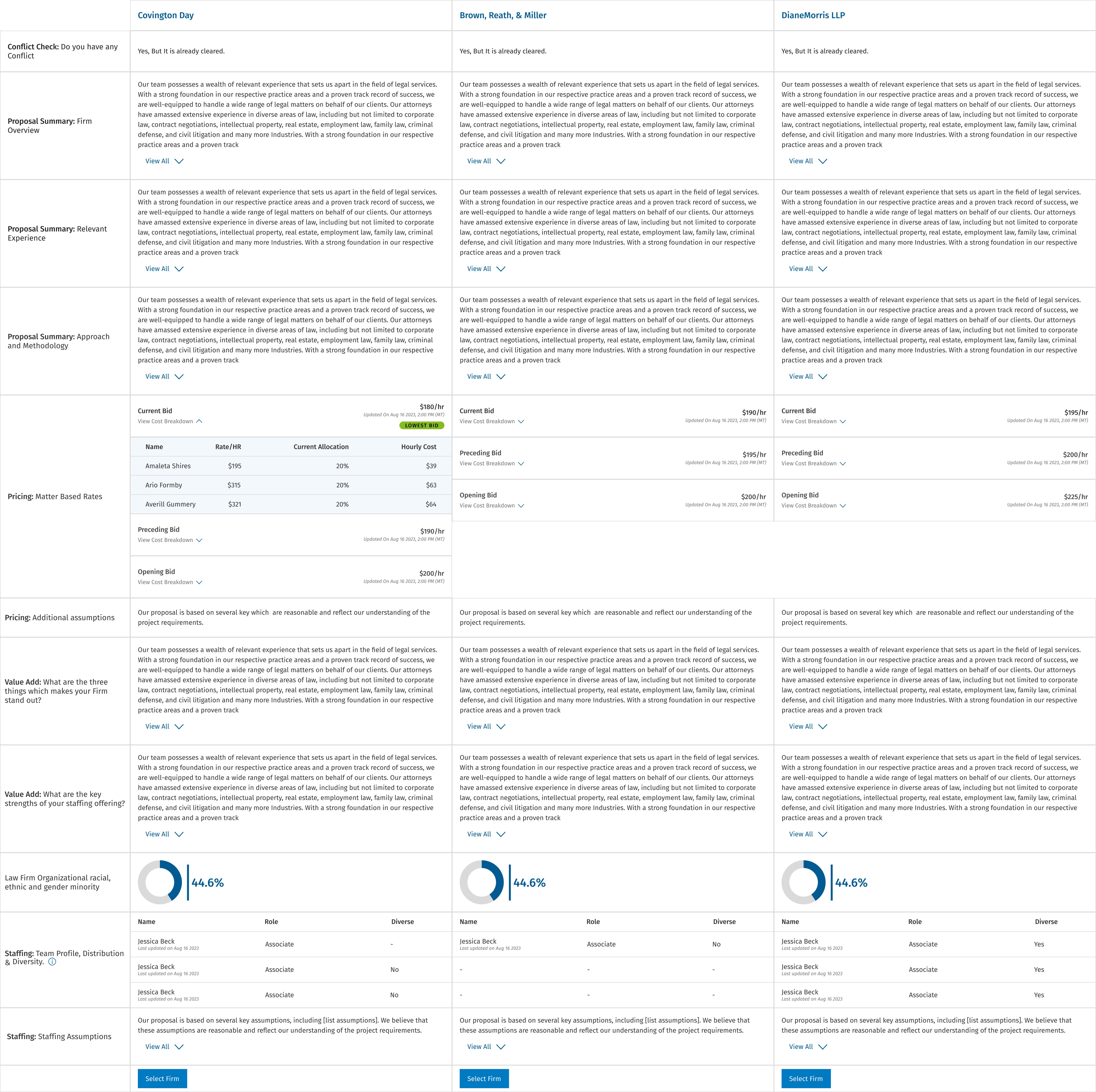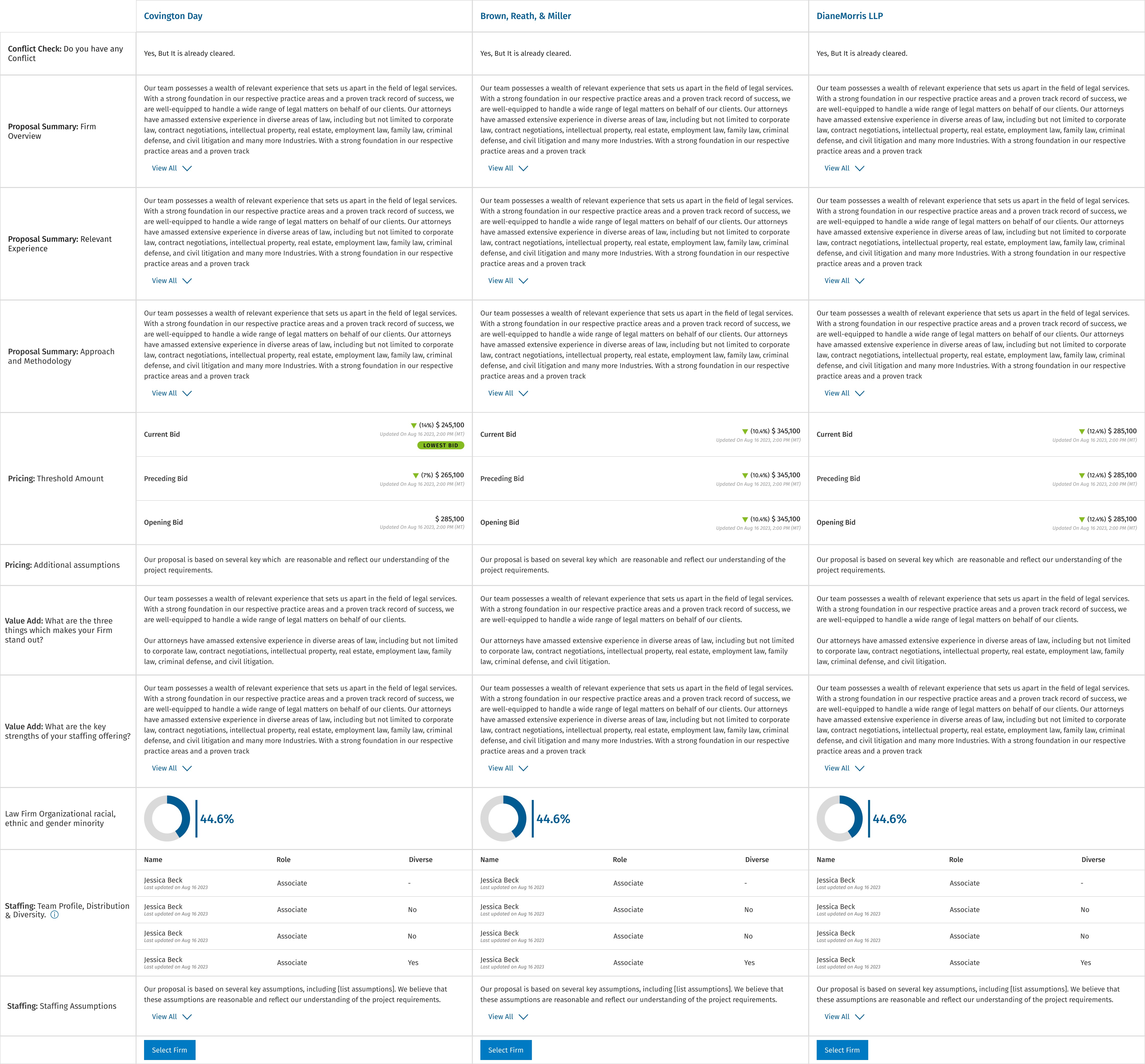 Generative AI summaries surface the key differentiators between law-firm proposals for quick evaluation.
